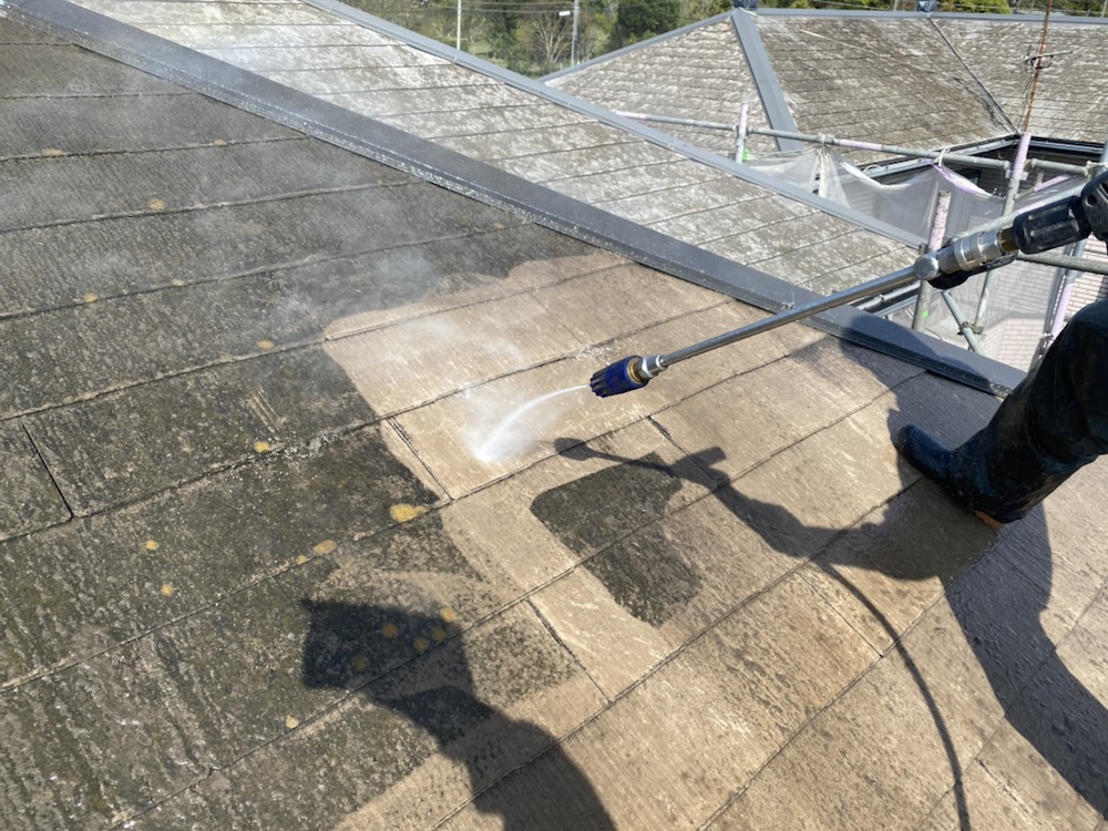 次に高圧洗浄で屋根・外壁の苔・汚れ等を綺麗に洗っていきます。