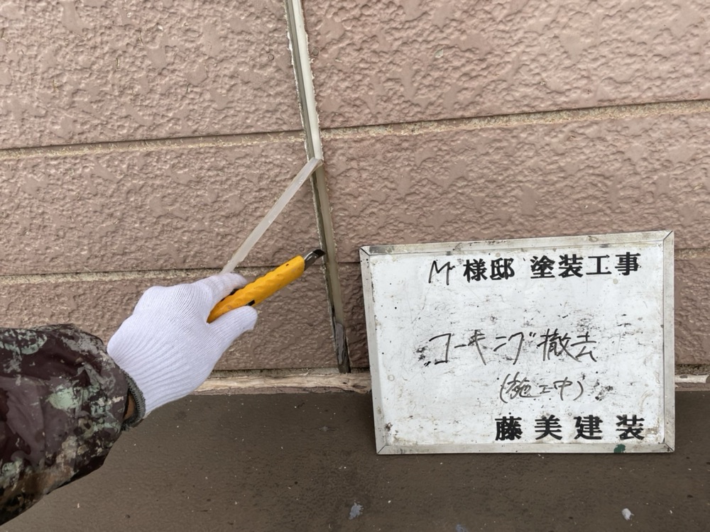 縦目地のコーキングは古いものを撤去し、プライマーを塗ったから新しいコーキングを打ち直します。窓周りは増し打ちをします。