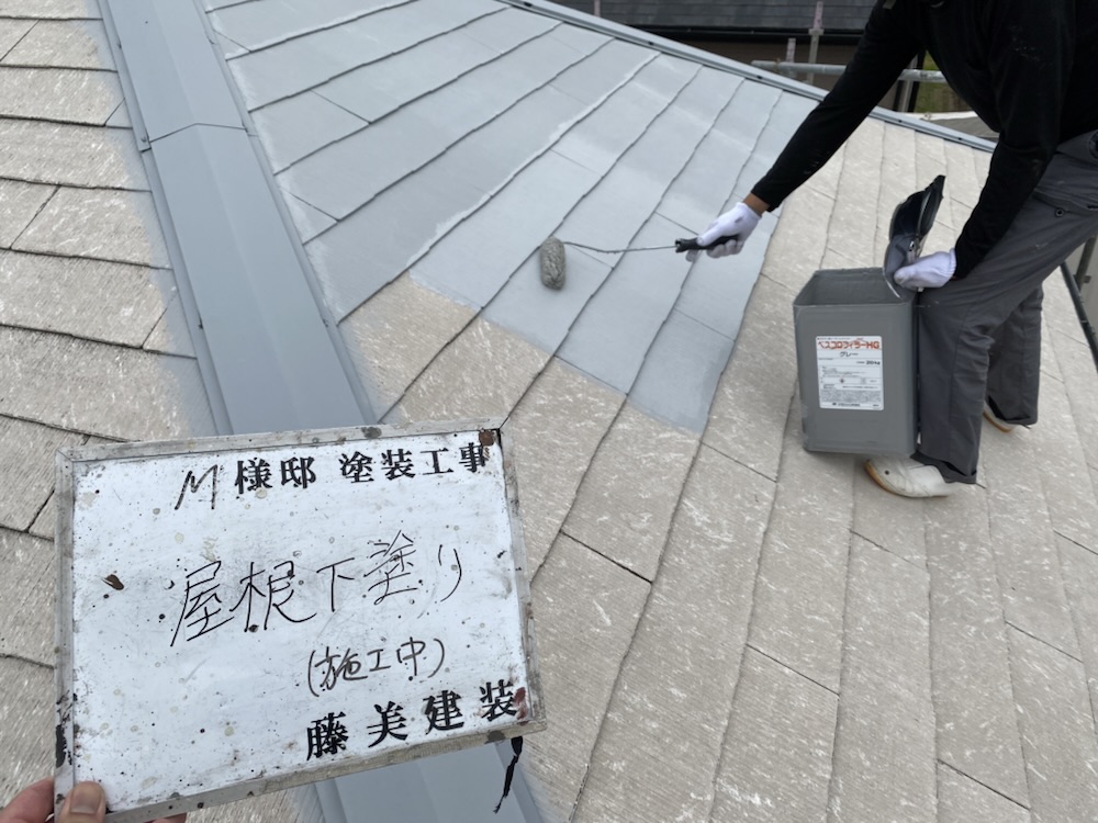 次に屋根の下塗りをします。材質によって部分的に下塗り材を変えて塗ります。