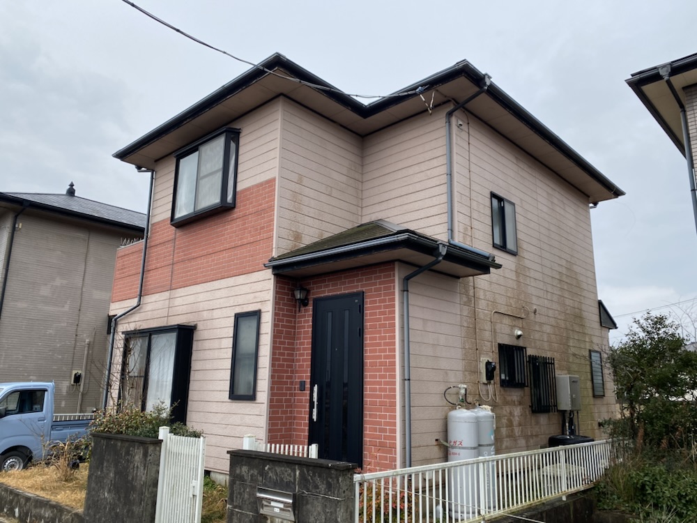 塗り替えが初めての為、屋根は苔が生えて、鉄部も錆がでていました。外壁は苔と全体的にチョーキング(白亜科現象)が凄く目立っていて、コーキングの劣化で軒に雨漏りもしていました。